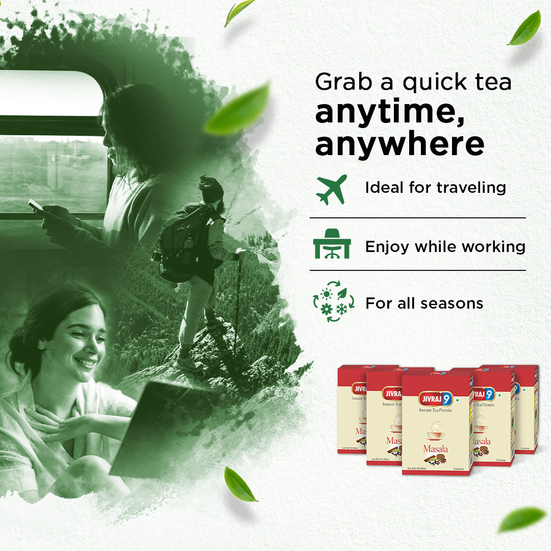 Ingredients: Made with 100% organic Assam tea leaves and a balanced blend of herbs and spices lime black pepper, clove, cinnamon and more, the Jivraj 9 Instant Premix