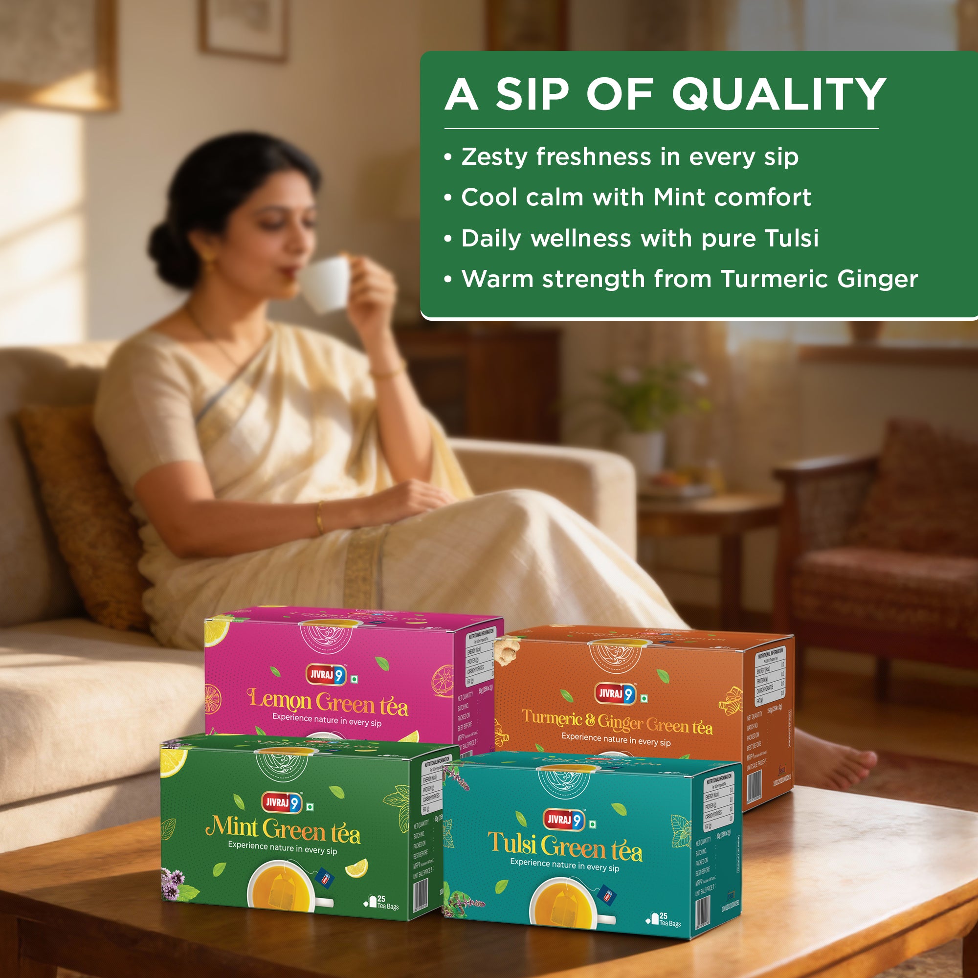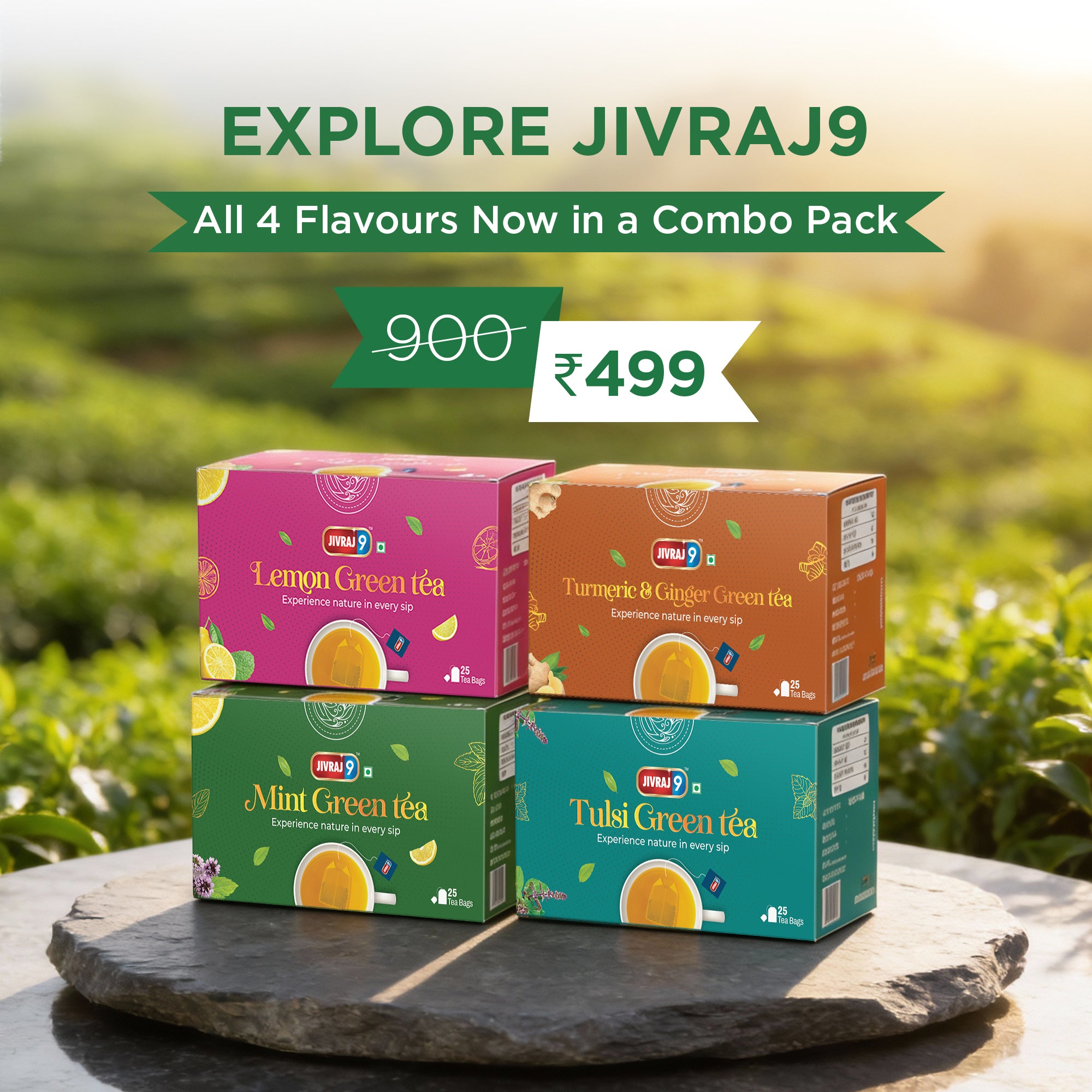 Jivraj9 Green Tea Combo | 4 Flavours - Mint, Tulsi, Lemon and Turmeric & Ginger | Supports Digestion & Detox | Hydrating Green Tea | Low Caffeine | Pack Of 4 | Each 25 Tea Bags Four Distinct Green Tea...